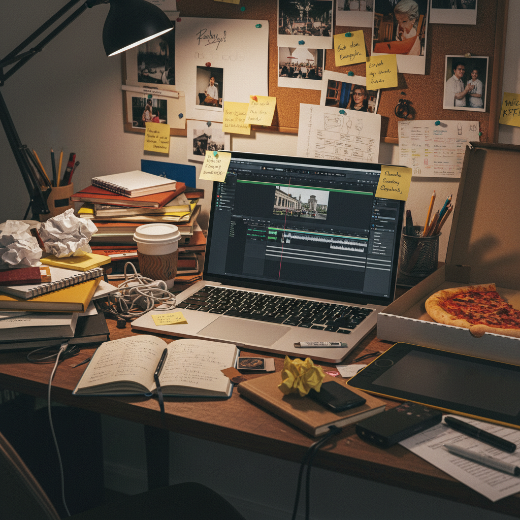 Kreatywny redaktor wśród stosu notatek i laptopów — chaos zarządzania treścią w portalach branżowych